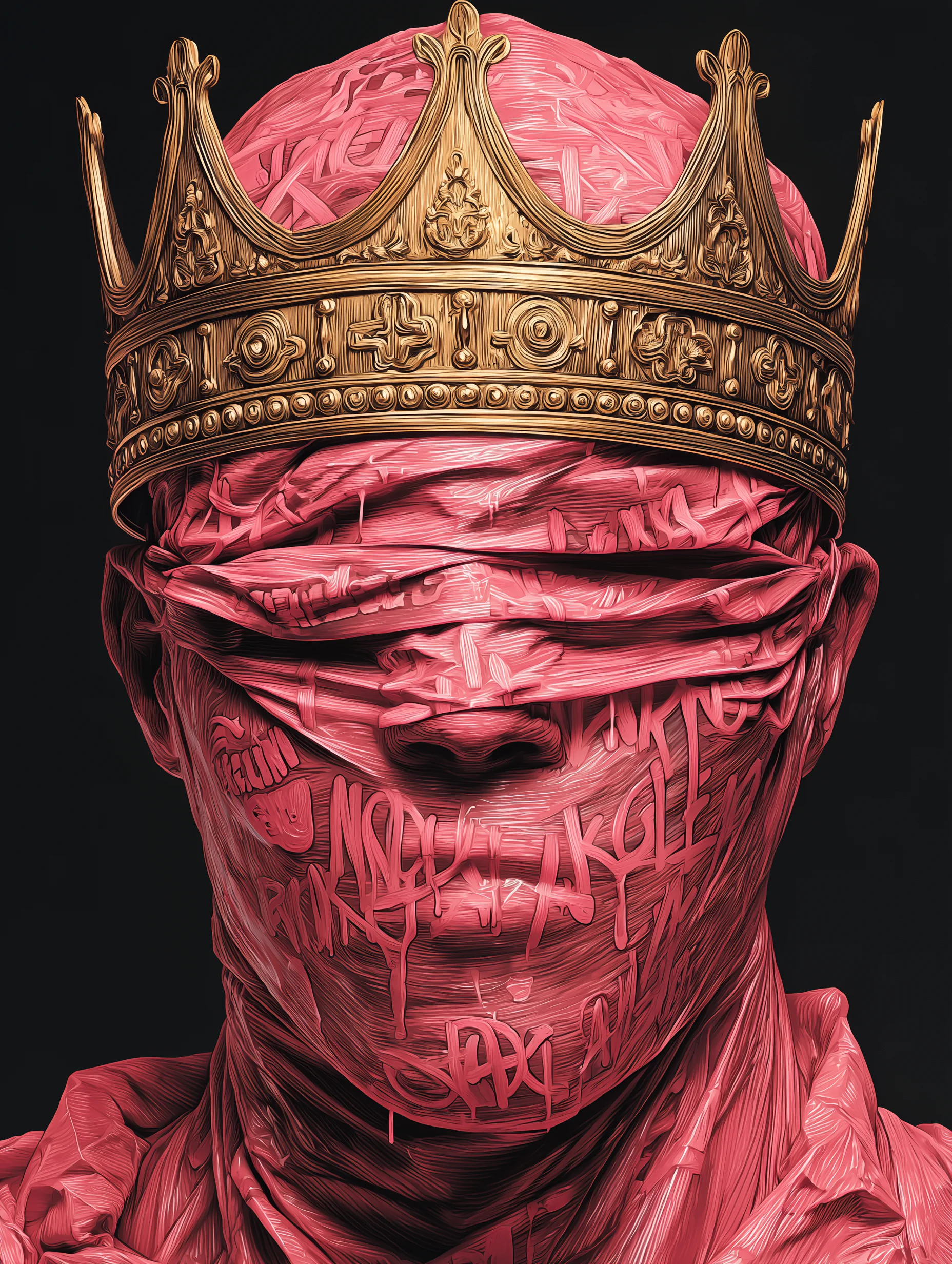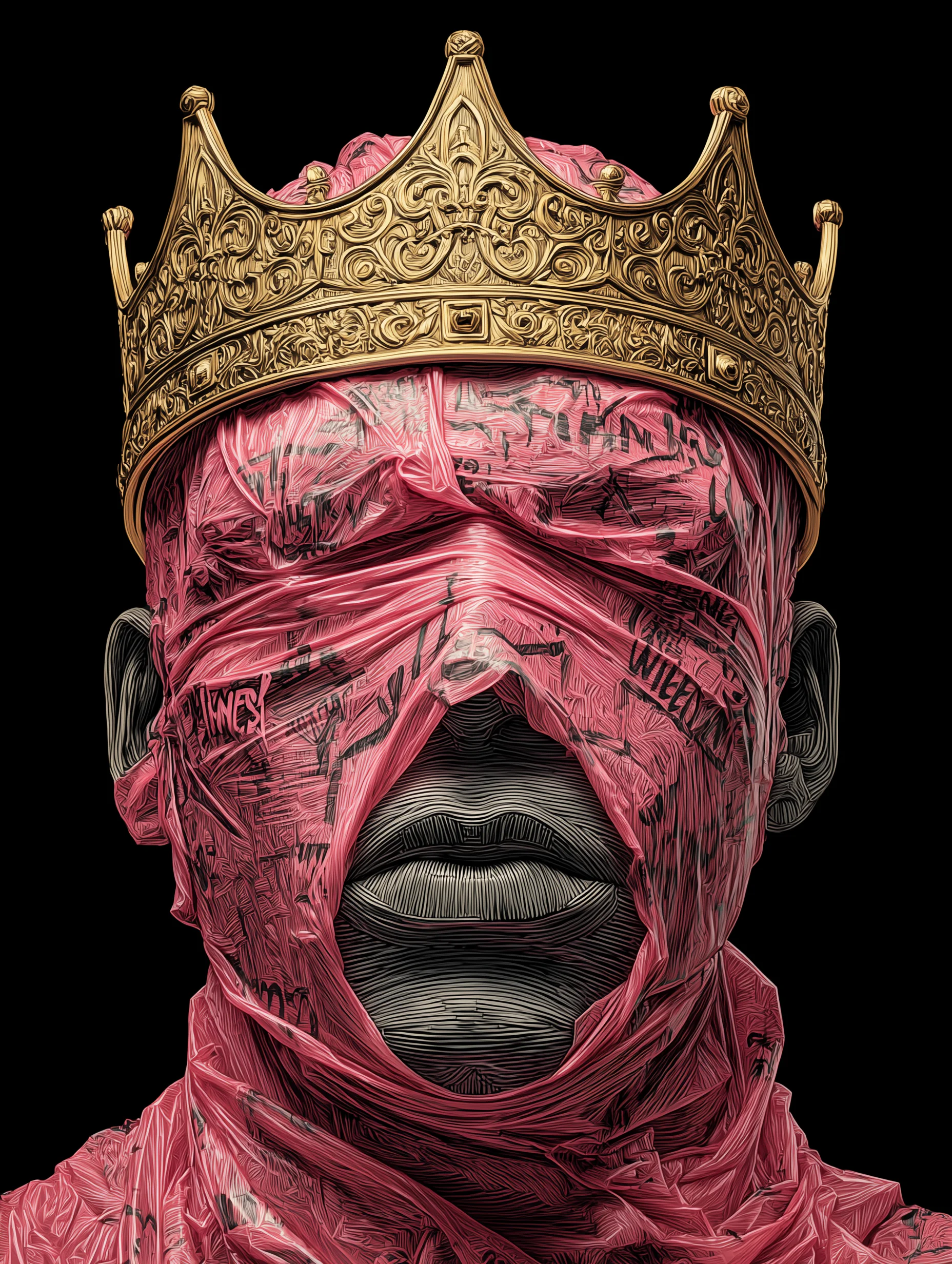 Dark surreal wallpaper pack featuring abstract blindfolded crowned figures wrapped in red textures. High-resolution conceptual king artworks ideal for desktop and mobile backgrounds, modern dark aesthetics, and artistic inspiration.